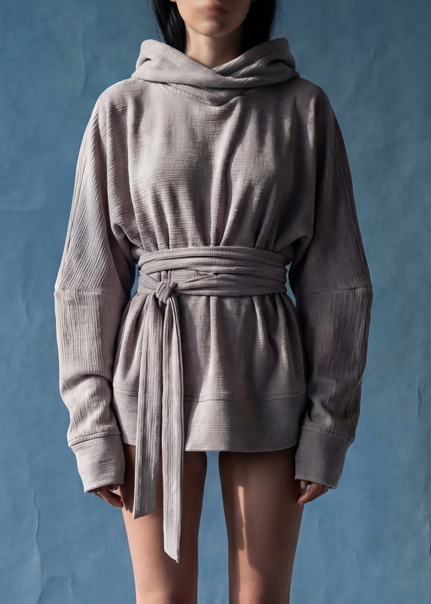 Hoodie bailarina. Hoodie largo de silueta relajada, confeccionado en tejido de hilo 100% algodón. Capucha amplia, mangas largas con puños extendidos y cintura ajustable mediante faja del mismo material, que permite ceñir o llevar suelto. Prenda pensada para uso diario o capas.