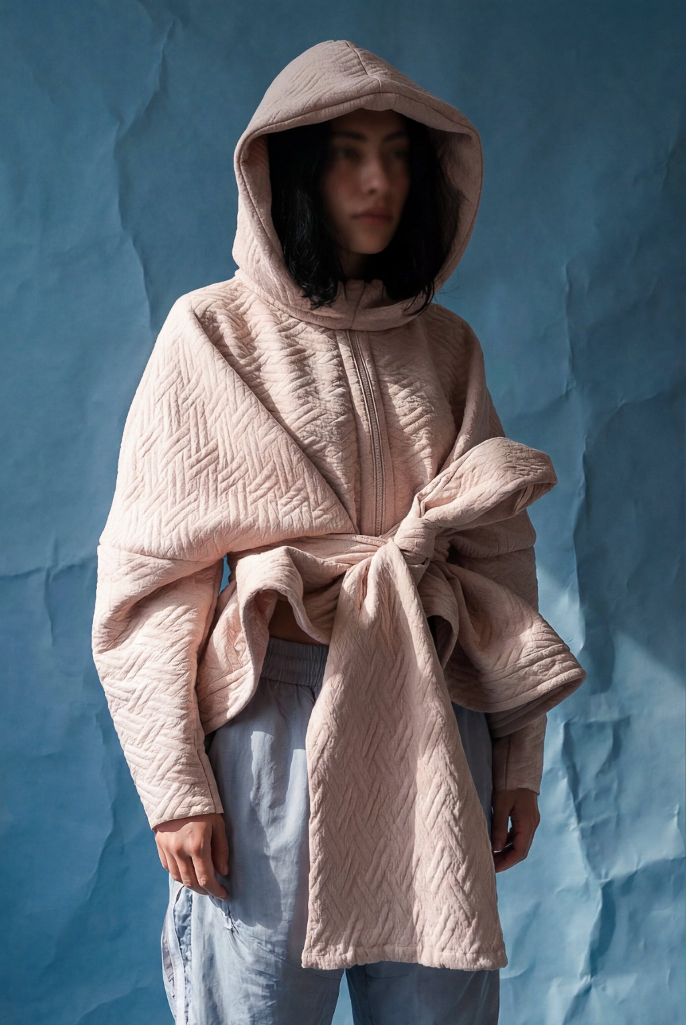 Hoodie colchon. Hoodie en tela de colchon, confeccionado en poliester. Capucha amplia, mangas largas con puños extendidos y cintura ajustable mediante faja del mismo material, que permite ceñir o llevar suelto.