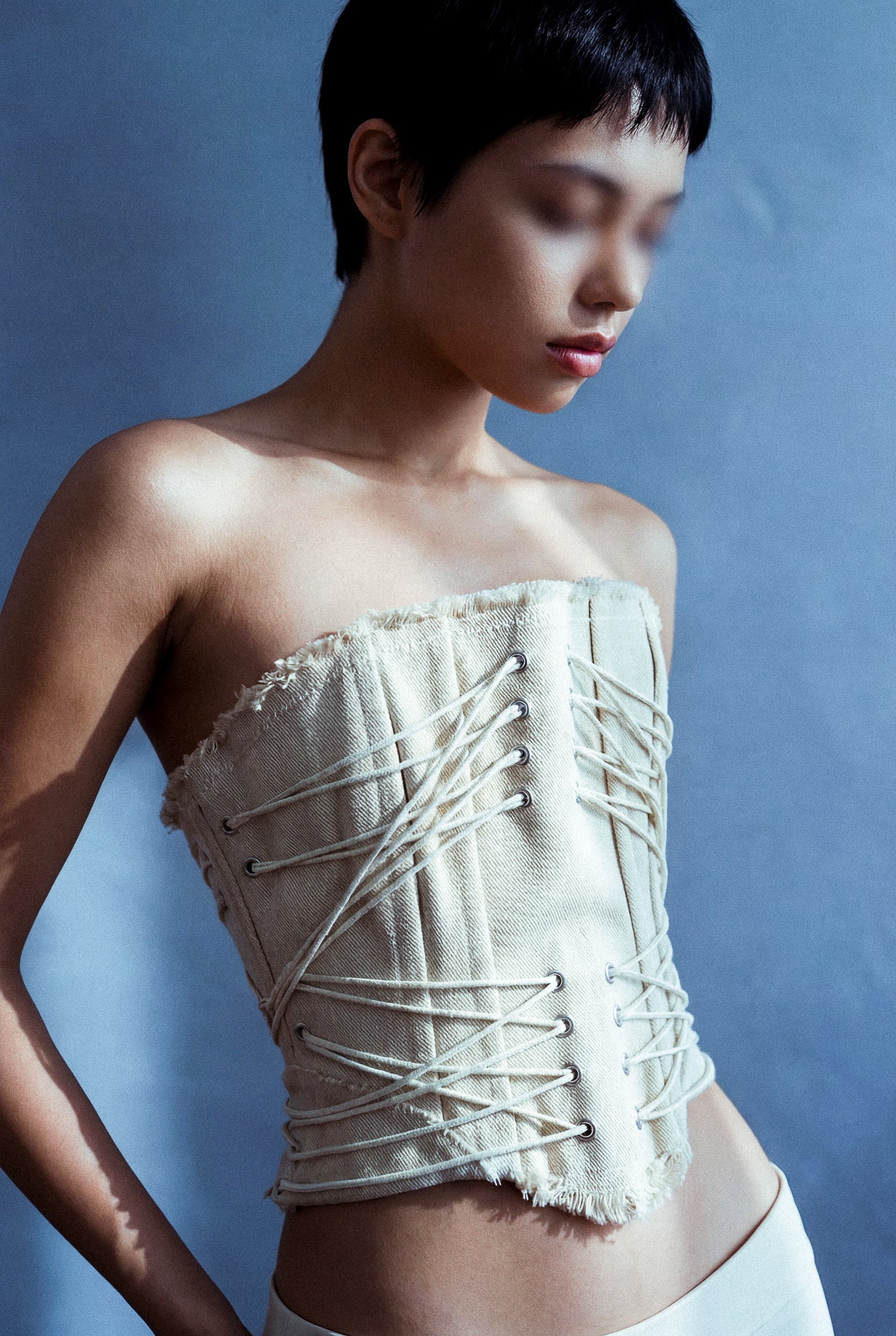 Corset pergamino crema en Denim crudo 100% algodón. Corset con silueta strapless, sistema de cordones ajustables en el frente y sobrepuestos en la cintura. Sistema de cierre cremallera metálica y ojales.