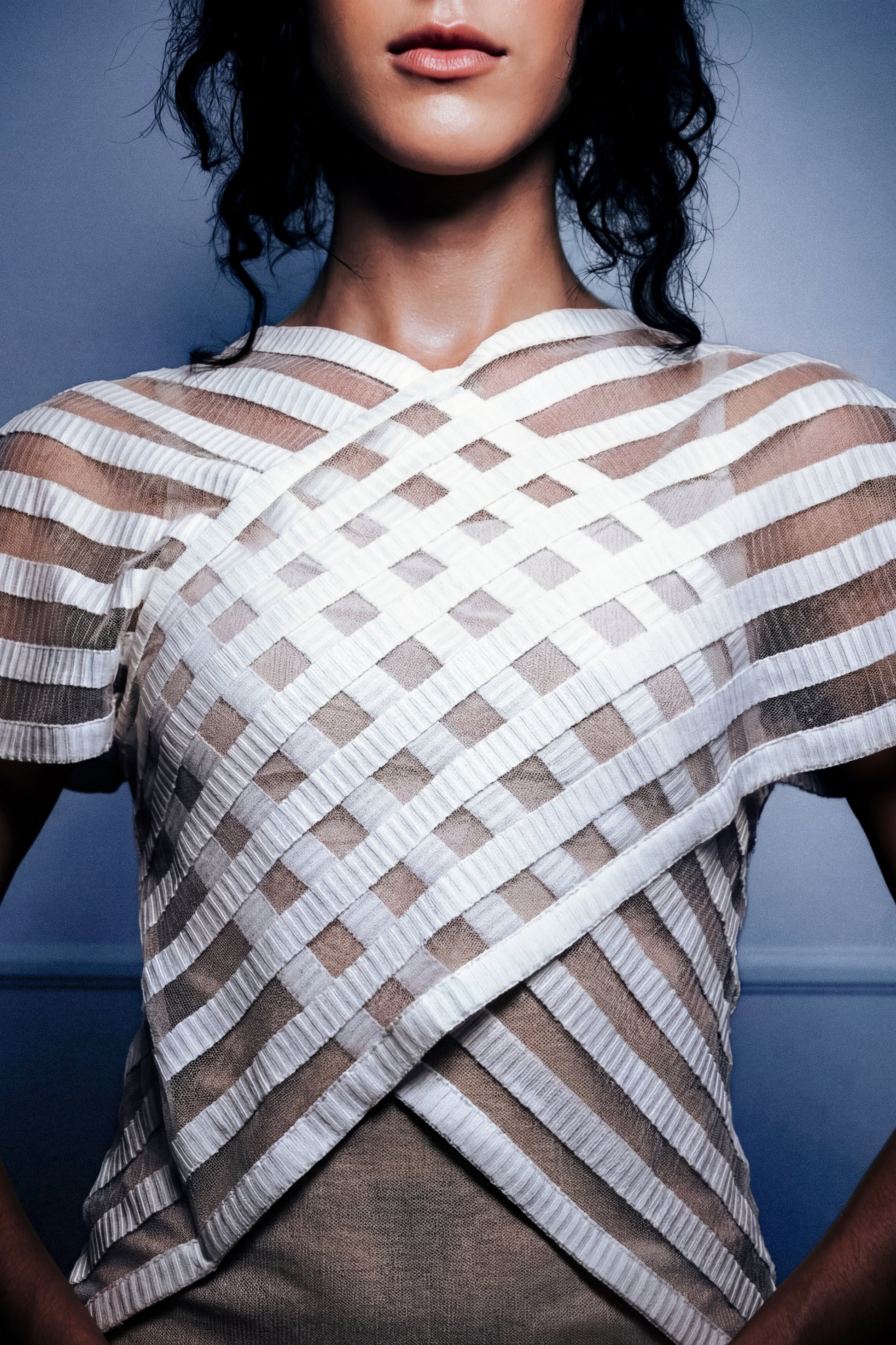 Top en tejido de algodón y poliester de rayas, se compone de dos partes que se sujetan con Botones colocados uno a uno, con puntadas delicadas.